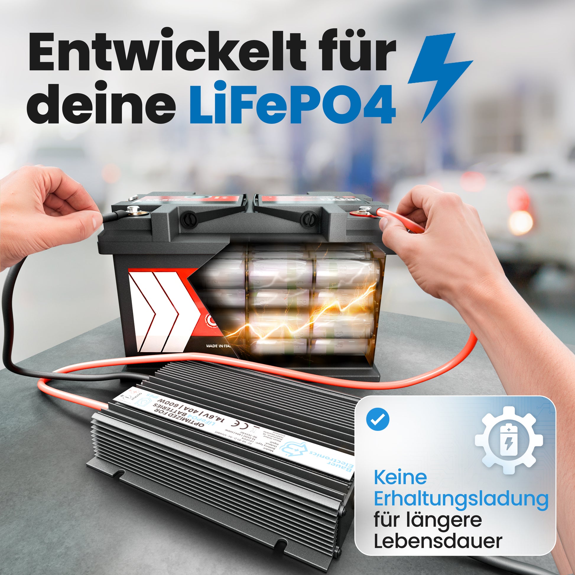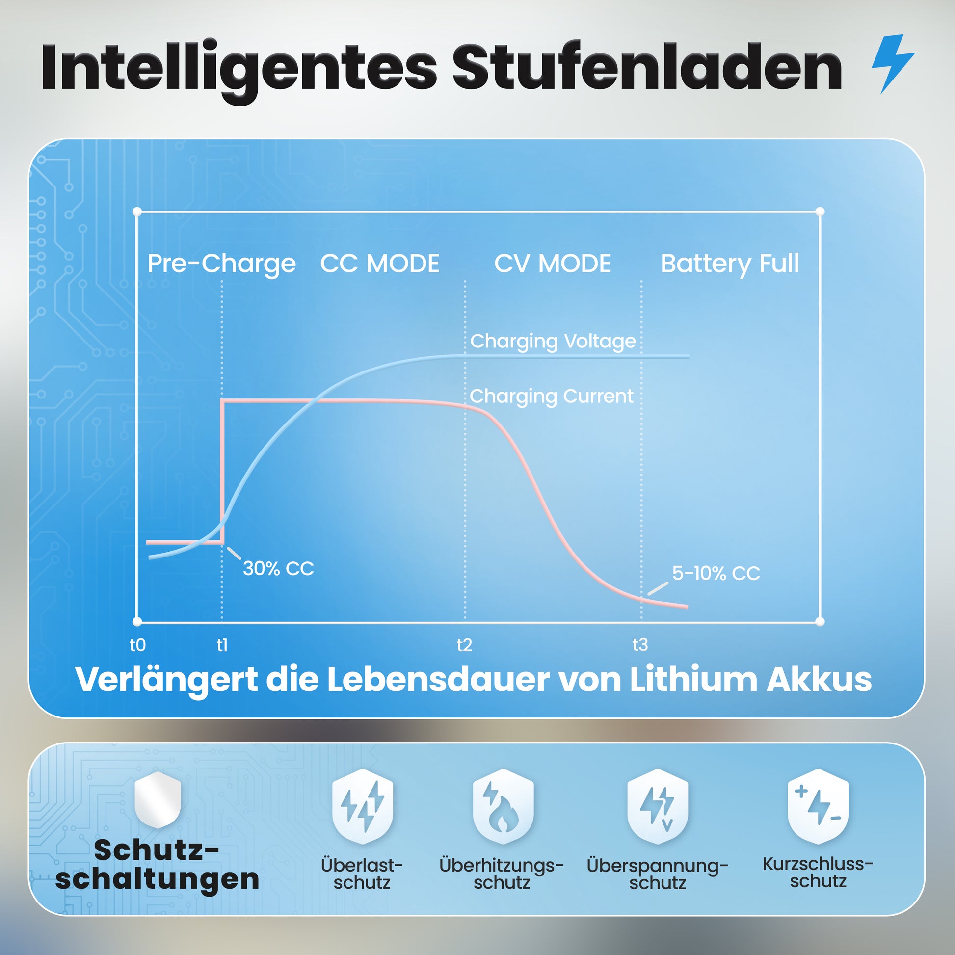 Unser hochmodernes LiFePO4 Batterieladegerät ist die perfekte Lösung für schnelles, effizientes und sicheres Laden Ihrer Lithium-Eisenphosphat-Batterien. Speziell für die Anforderungen dieser Batterien entwickelt, bietet es eine Reihe praktischer und besonders leistungsstarker Eigenschaften.
