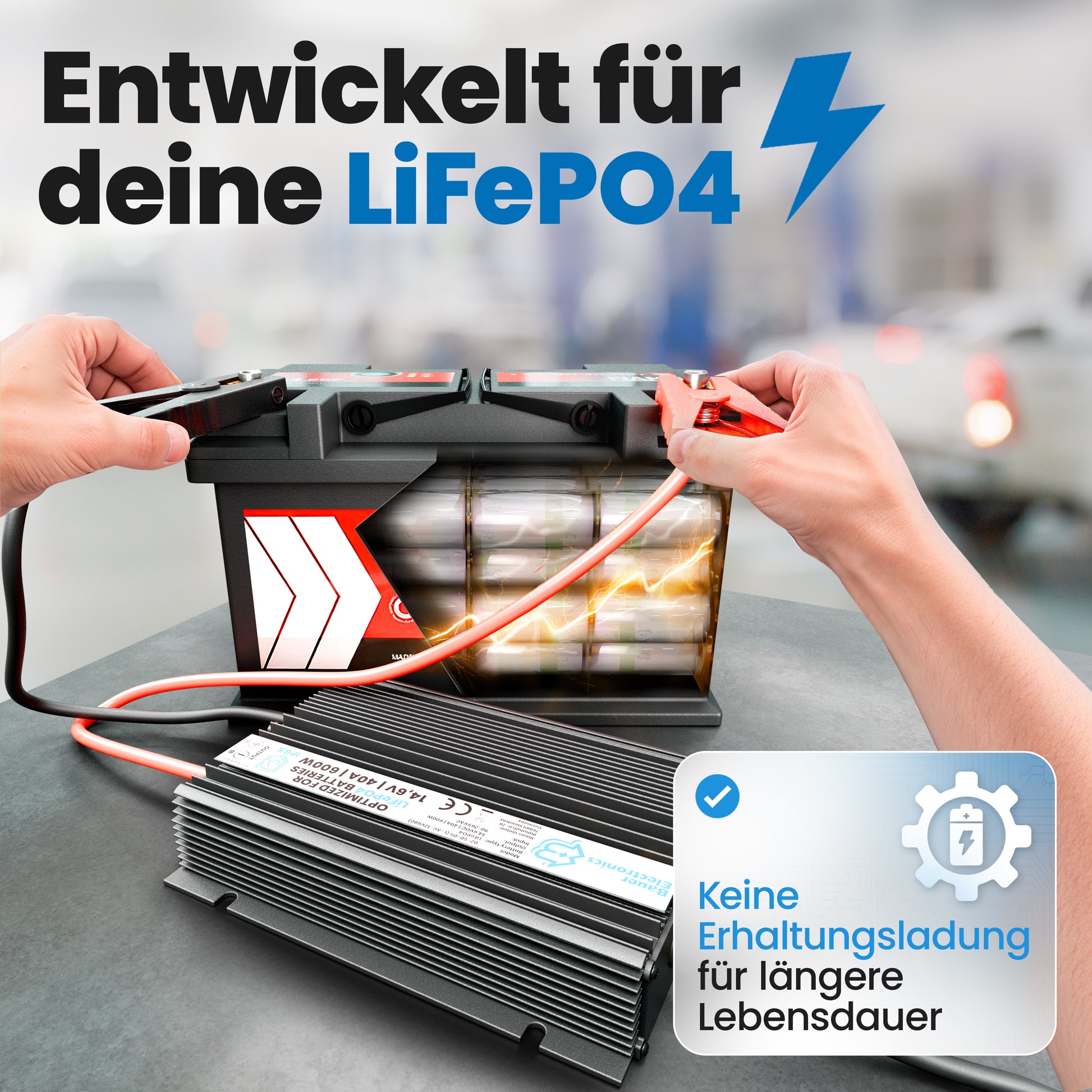 Unser hochmodernes LiFePO4 Batterieladegerät ist die perfekte Lösung für schnelles, effizientes und sicheres Laden Ihrer Lithium-Eisenphosphat-Batterien. Speziell für die Anforderungen dieser Batterien entwickelt, bietet es eine Reihe praktischer und besonders leistungsstarker Eigenschaften.