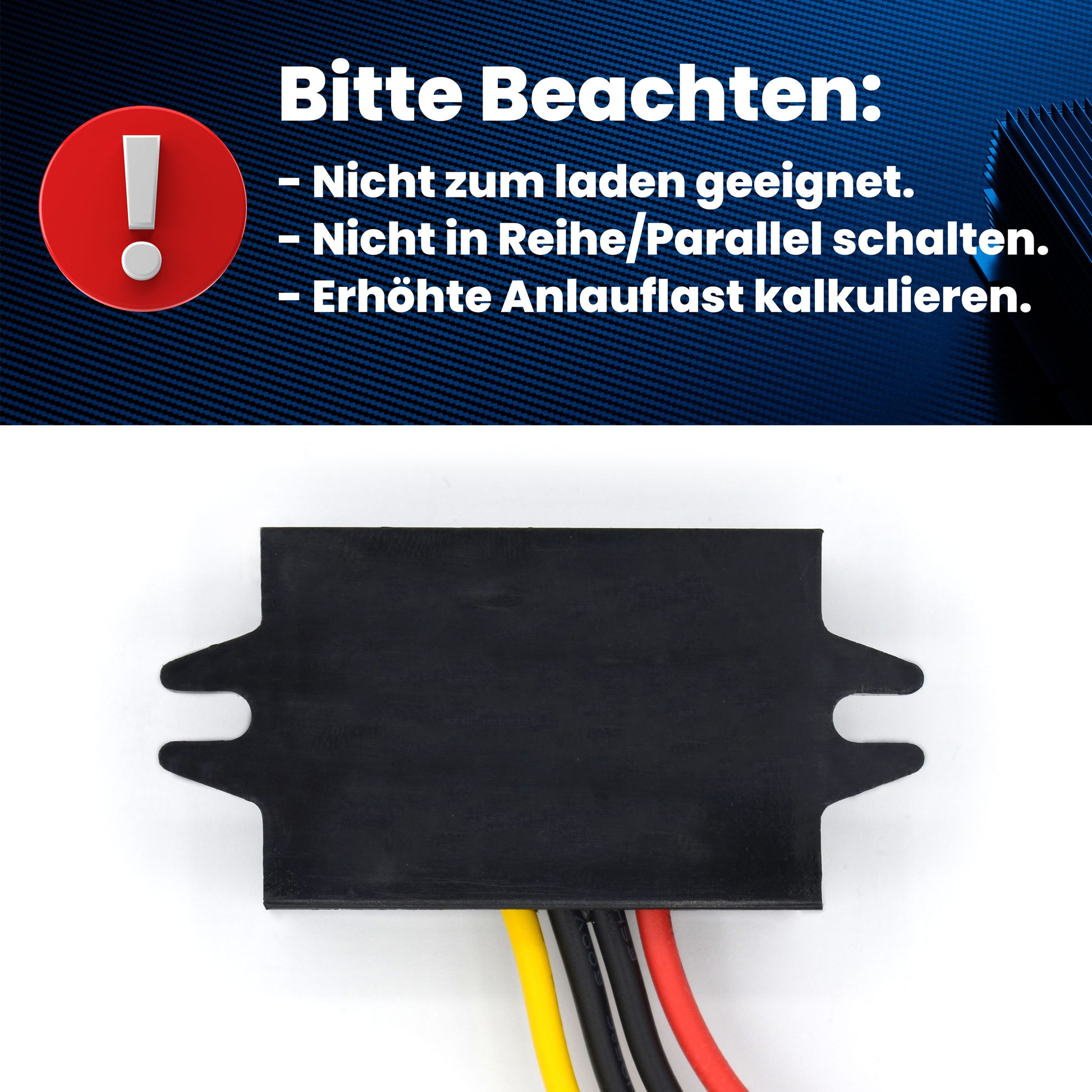 Caution | Never operate electrical appliances permanently at the power limit, as this may cause damage. Ensure that the cables are intact and that the polarity of the connections is correct.