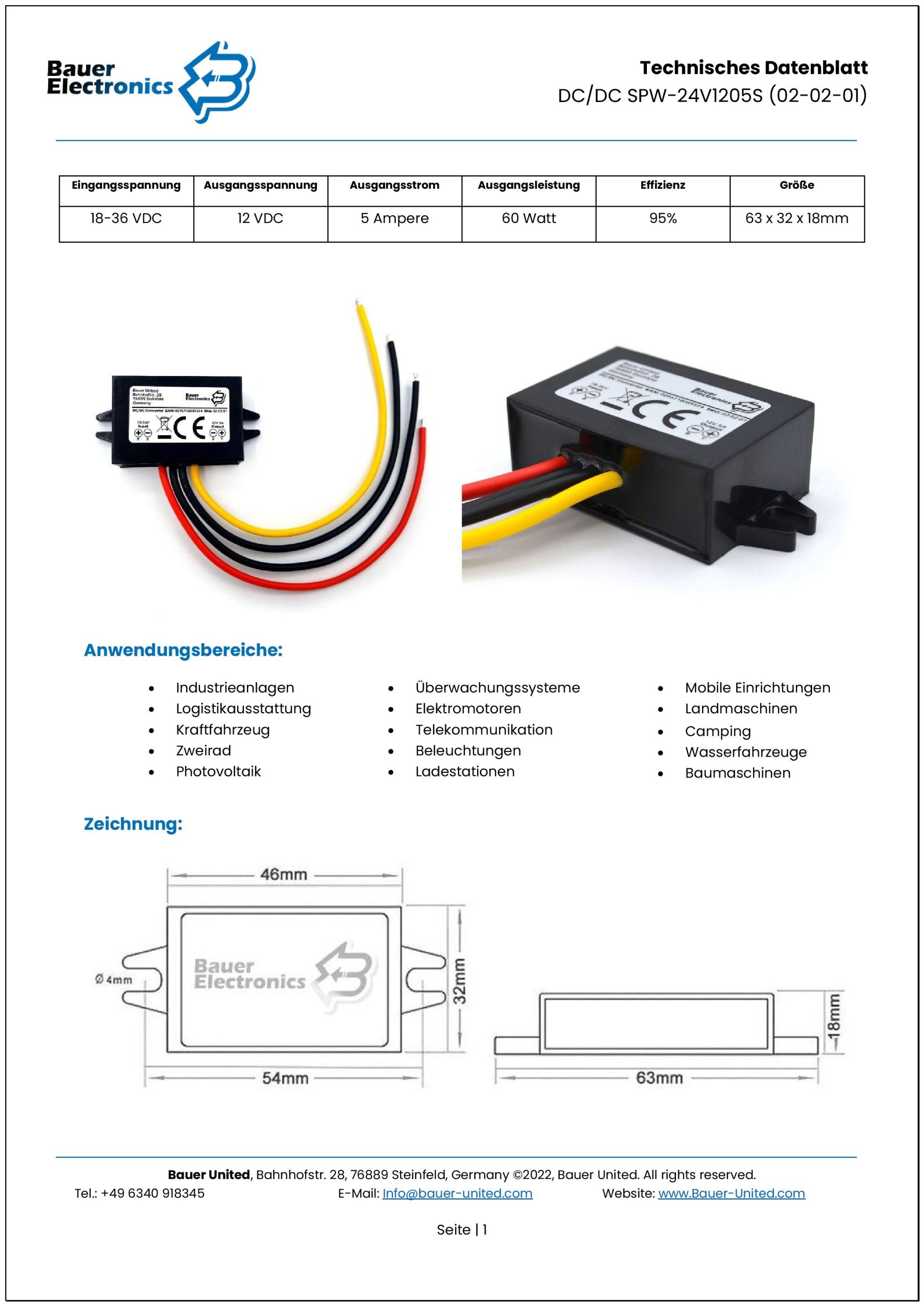 Connection | The DC/DC converter is supplied with tin-plated, open ends. Please refer to the respective data sheet for the cross-section and cable length.