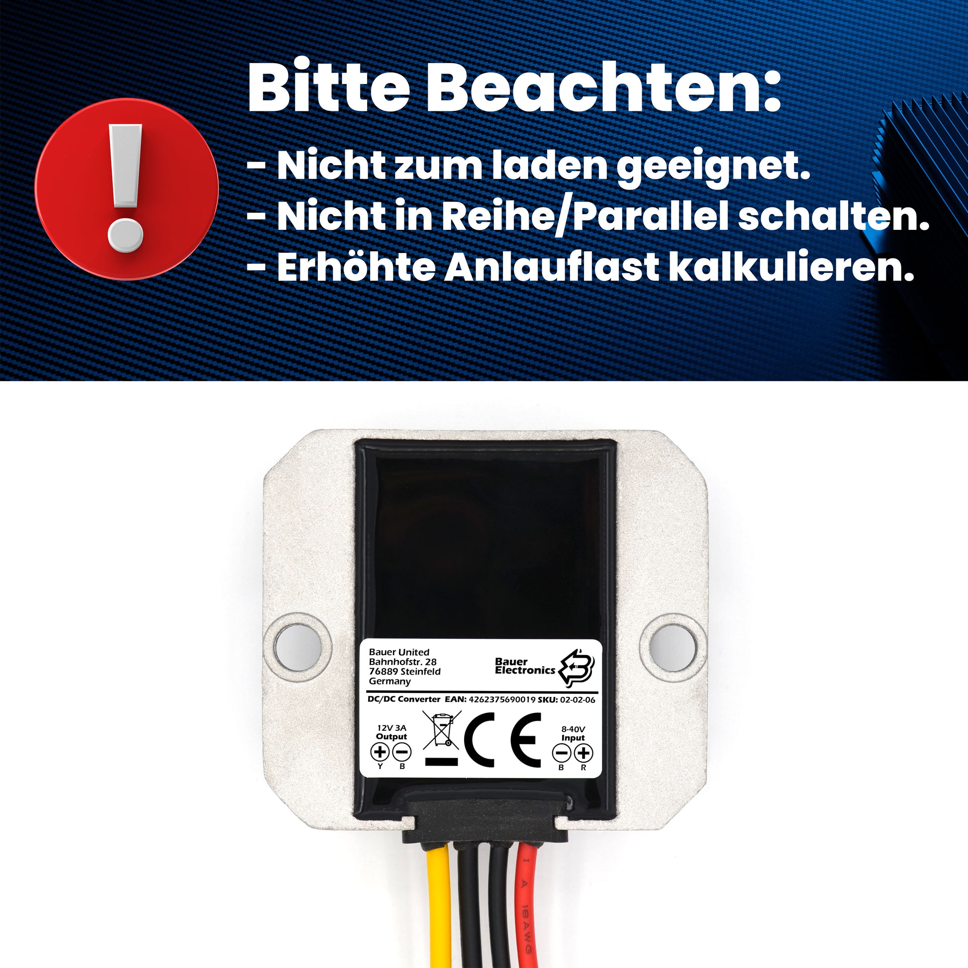 Caution | Never operate electrical appliances permanently at the power limit, as this may cause damage. Ensure that the cables are intact and that the polarity of the connections is correct.