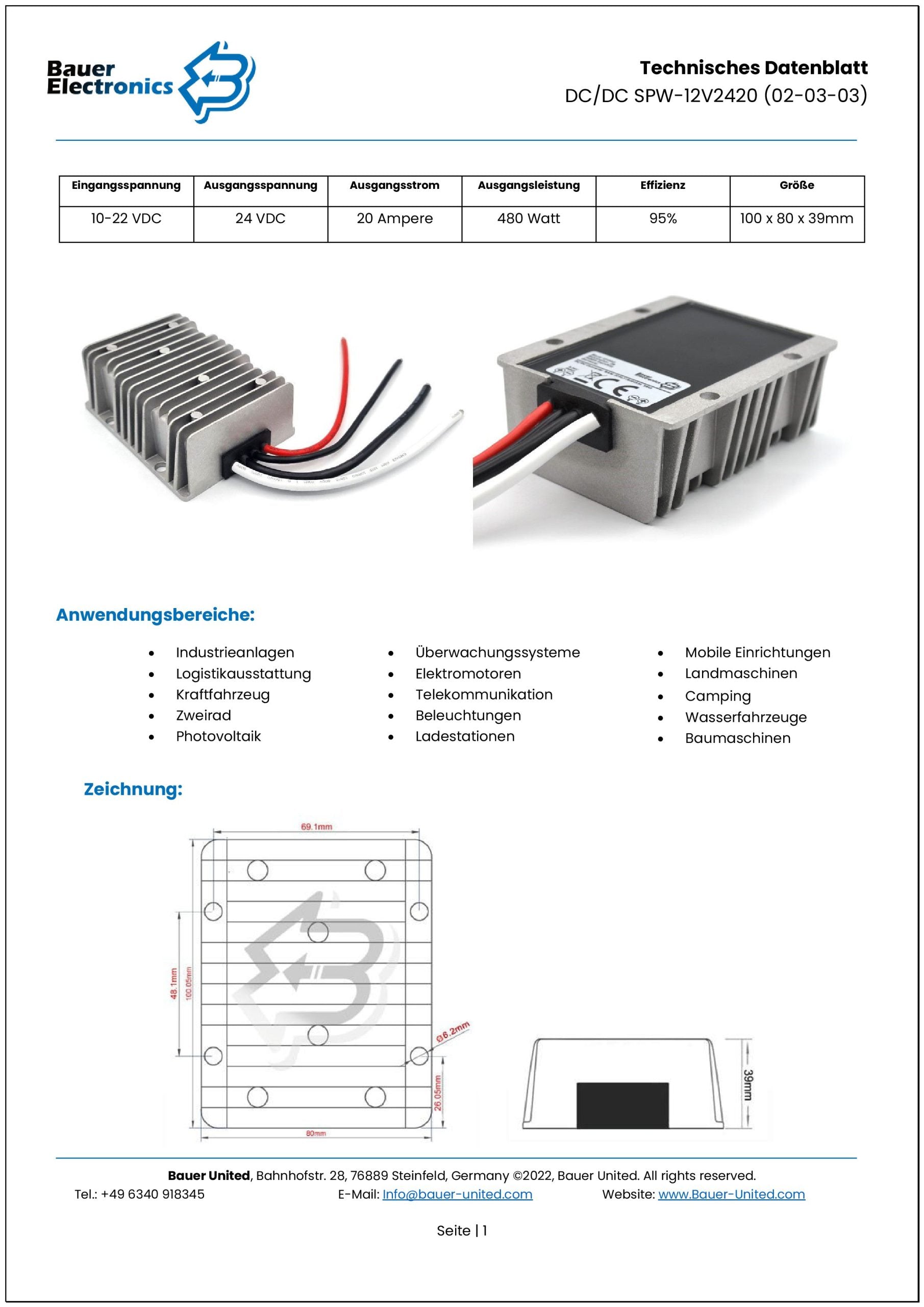 Connection | The DC/DC converter is supplied with tin-plated, open ends. Please refer to the respective data sheet for the cross-section and cable length.