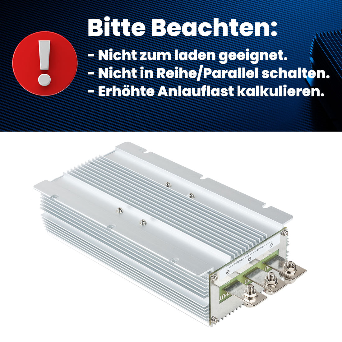 Caution | Never operate electrical appliances permanently at the power limit, as this may cause damage. Ensure that the cables are intact and that the polarity of the connections is correct.