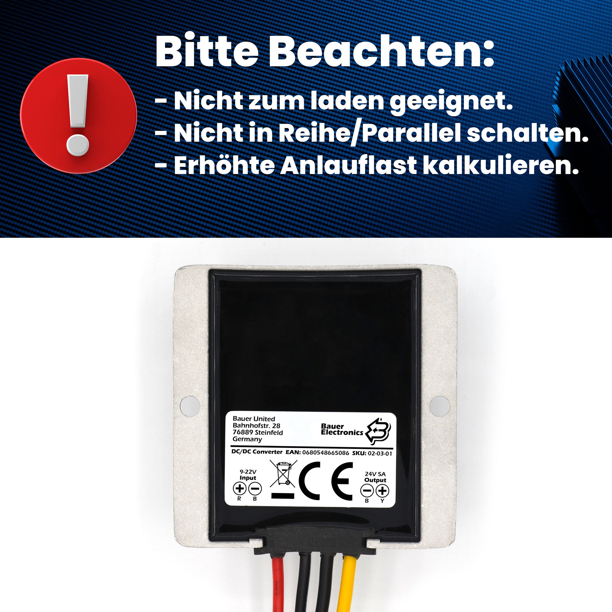 Caution | Never operate electrical appliances permanently at the power limit, as this may cause damage. Ensure that the cables are intact and that the polarity of the connections is correct.