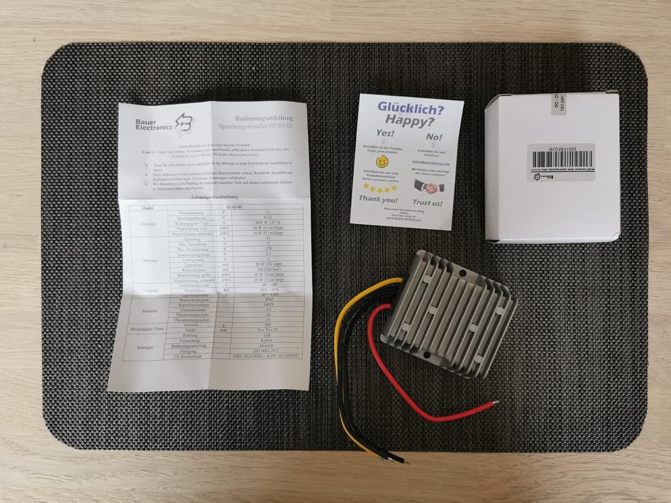 Der Spannungswandler der Firma Bauer wurde gut verpackt und pünktlich geliefert. Zum Lieferumfang gehört der Spannungswandler und eine deutsche Bedienungsanleitung.Er wurde in Deutschland hergestellt, ist gut verarbeitet und sieht sehr hochwertig aus. In dem Aluminium- Kühlkörper ist die Elektronik mit Epoxidharz eingegossen. Die vier Anschlussleitungen sind mit ca. 16 cm relativ kurz. Er hat die Schutzart IP68 und könnte somit auch im Wasser betrieben werden.Eine Eingangspannung von 9-22 Volt DC wird mit diesem Spannungswandler in eine konstante Gleichspannung von 24 Volt umgewandelt. Den maximal angegebenen Ausgangsstrom von 5 Ampere kann der Wandler auch ohne aktive Kühlung leisten und arbeitetet dadurch geräuschlos. Umfangreiche Schutzeinrichtungen schützen den Wandler selbst, den Verbraucher sowie die angeschlossene Spannungsquelle. Durch eine integrierte selbstrückstellende Sicherungen ist das Modul auch nach einem Kurzschluss nicht defekt und kann ohne Einschränkungen weiter verwendet werden. Mein Mann hat den Wandler in unser altes Wohnmobil eingebaut und betreibt damit eine 24 Volt LKW-Kühlbox.Der Wandler funktioniert hervorragend und ist absolut geräuschlos. Wir hätten uns nur längere Anschlussleitungen gewünscht, dann wäre das Teil perfekt.