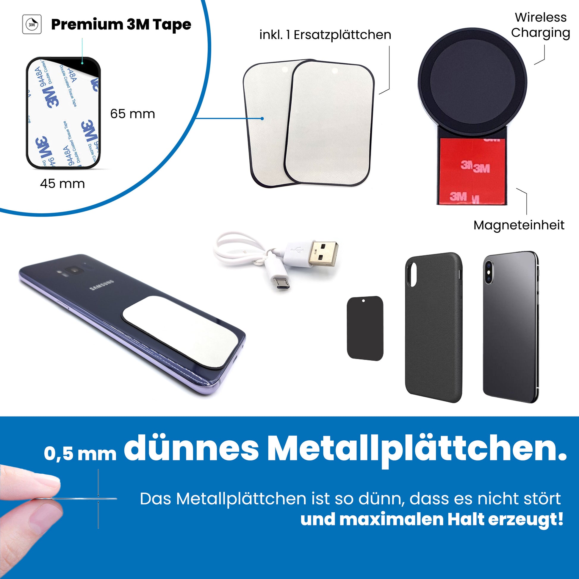 with common magnetic cell phone holders, e.g. in the car. Universal attachment for every device. Whether small or large smartphones, navigation devices, MP3 players or other devices with a smooth surface can be attached.