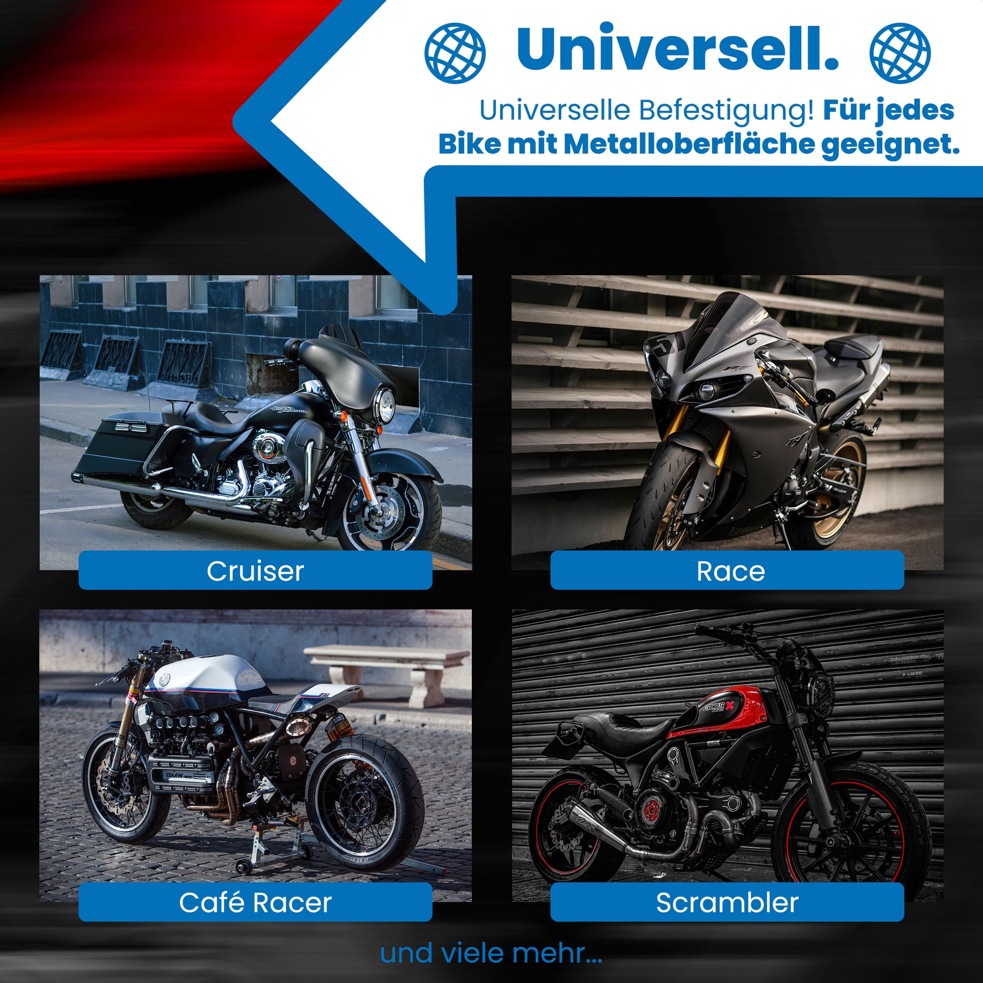 In addition, the holder can be attached to any metal surface. Whether it's a fairing panel on a scooter or a metal tank on a motorcycle.