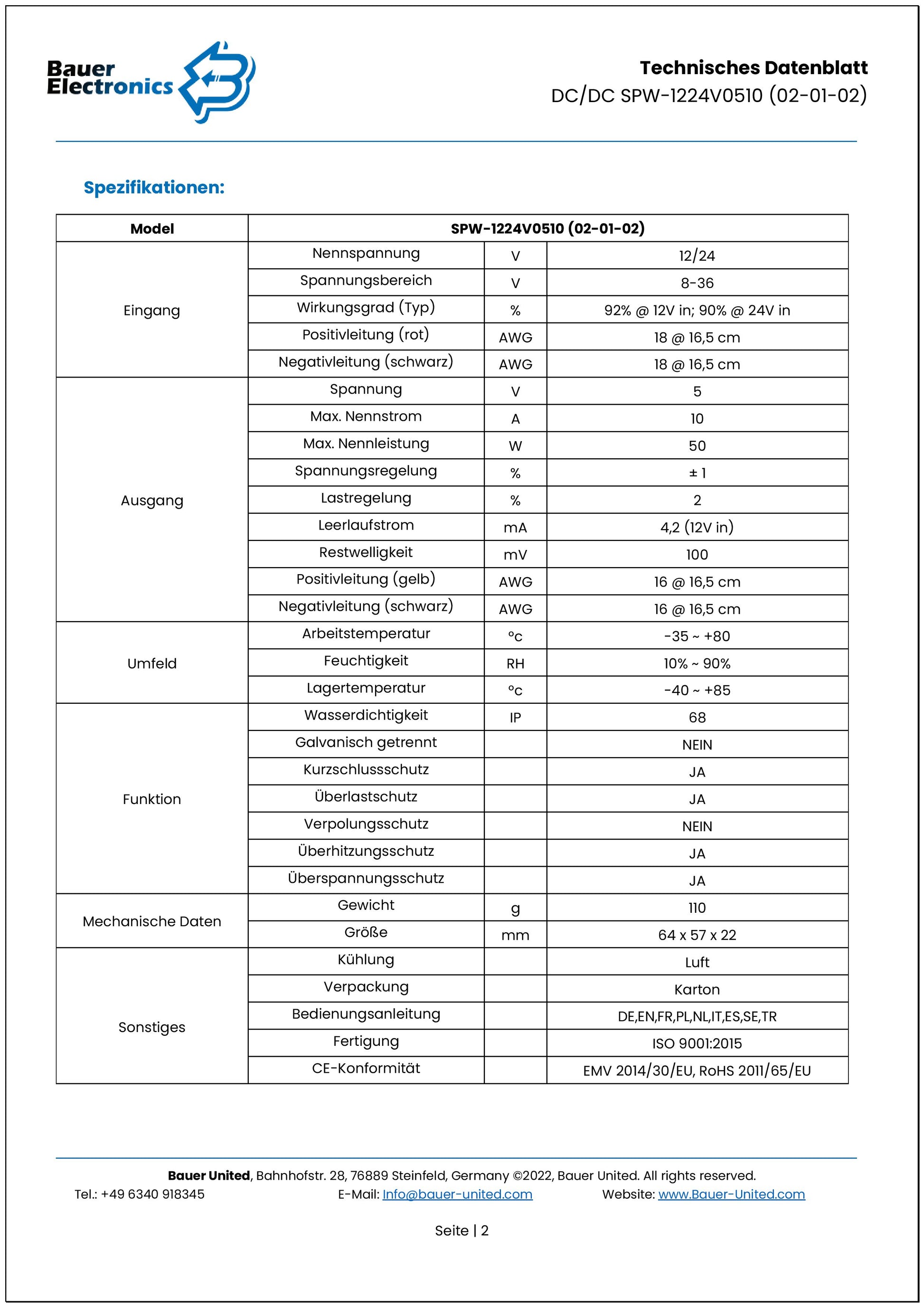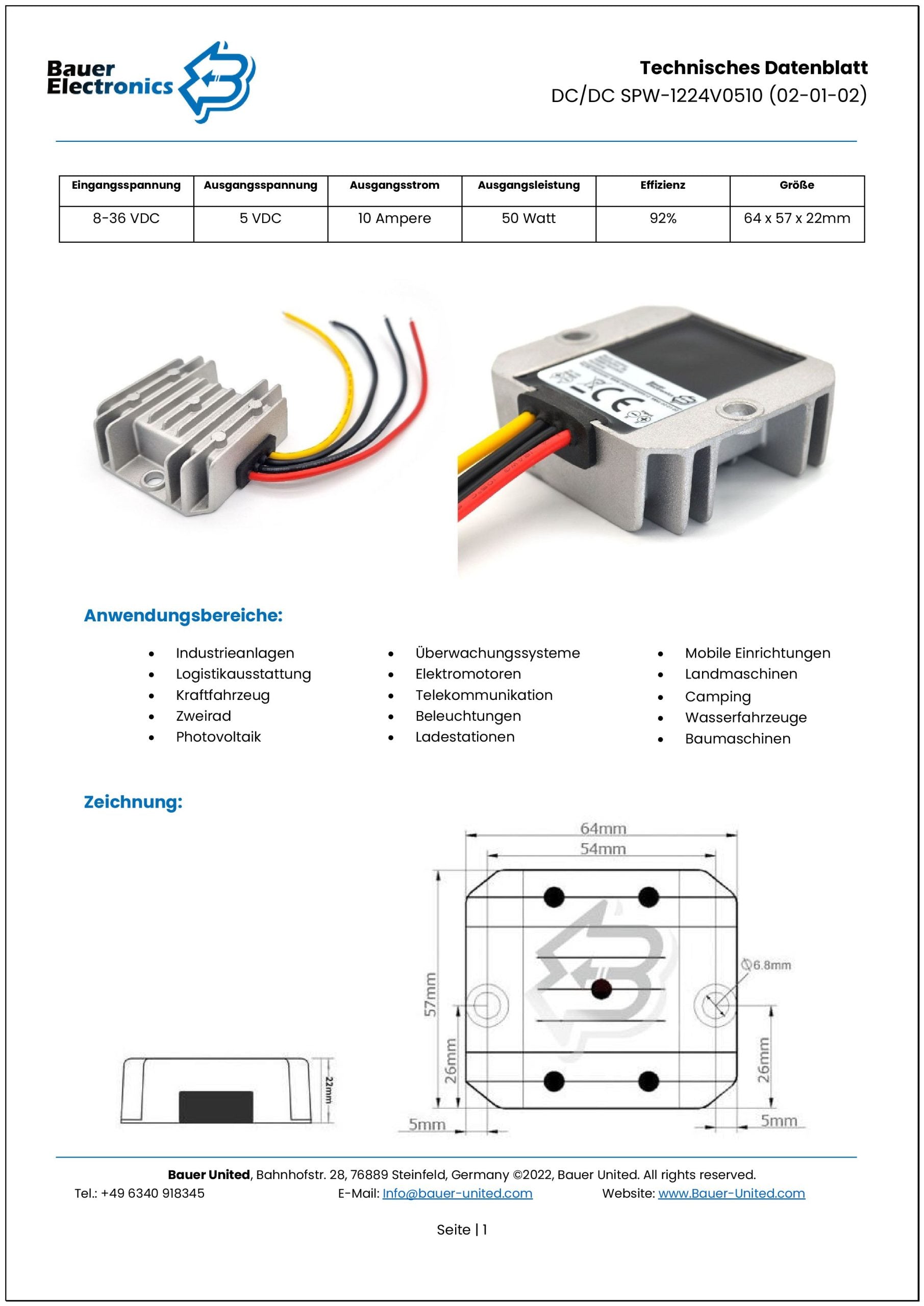 Connection | The DC/DC converter is supplied with tin-plated, open ends. Please refer to the respective data sheet for the cross-section and cable length.